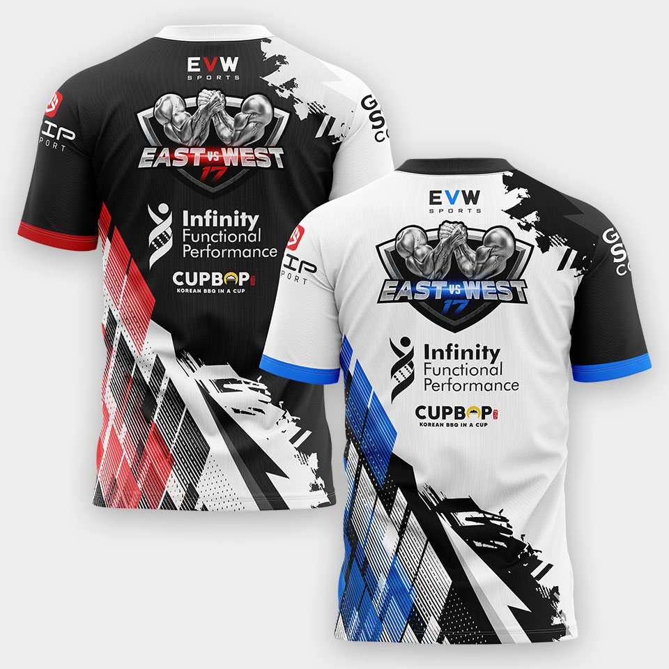 Get ready to flex your muscles with our East vs West 17 Jersey! Made from high-quality, comfortable cotton, this shirt is perfect for showing off your strength and determination. The T-Shirt features a simple but bold graphic on the front and back of the East vs West 17 logo along with the logos of the Sponsors of the event.