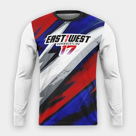 Represent the intensity of the biggest armwrestling event in the world with the exclusive East vs West 17 Long Sleeve. Designed for die-hard fans and competitors alike, this black-to-red gradient shirt captures the fire and passion of armwrestling’s greatest warriors.